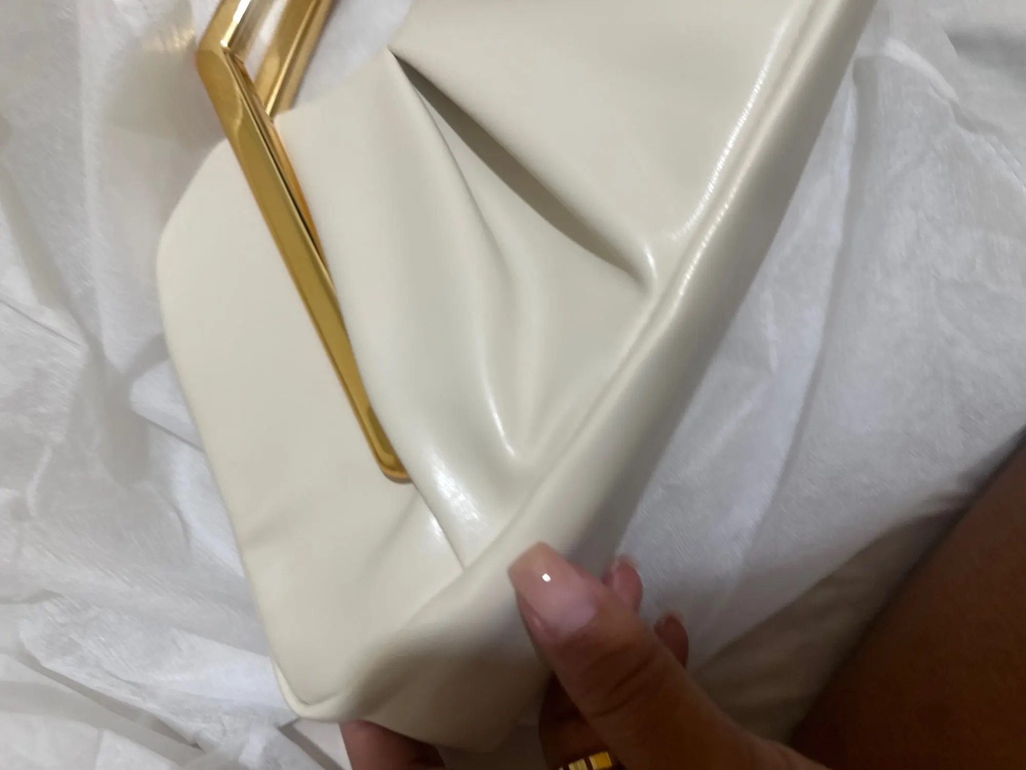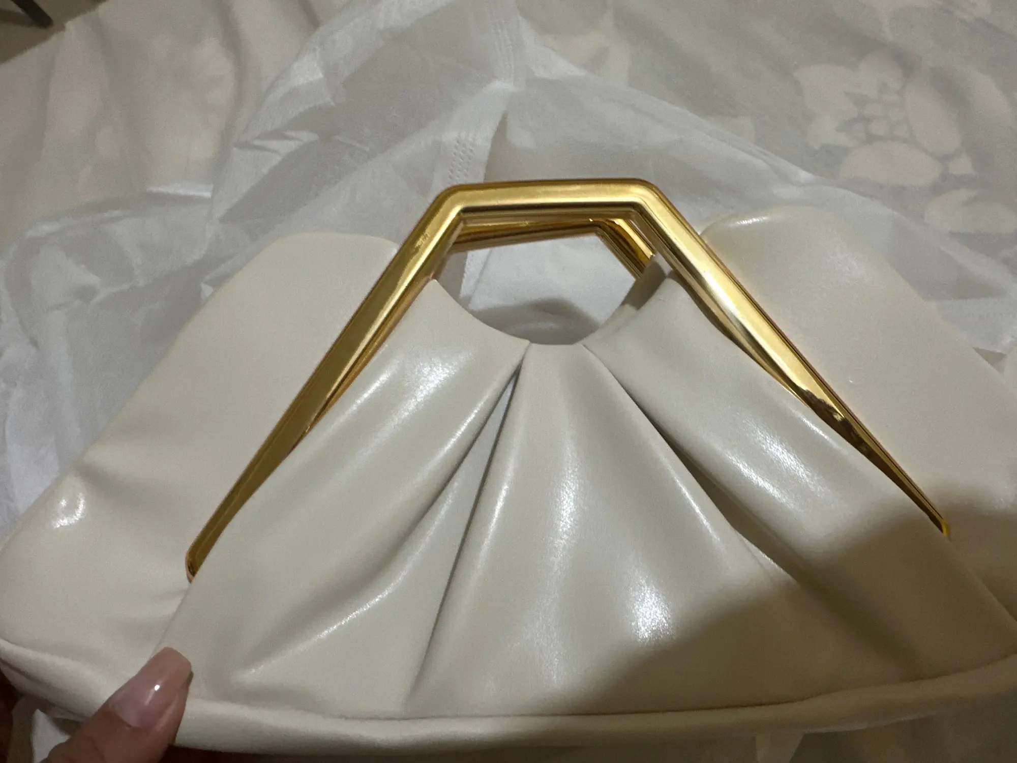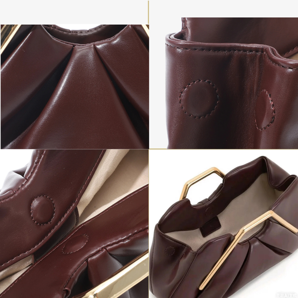 Aurelia Clutch is finished with smooth faux leather, sculptural draped folds, and clean, precise stitching throughout. Subtle magnetic closures and a neatly structured interior keep the silhouette refined, while the polished gold-tone handle adds a luxurious finishing touch.