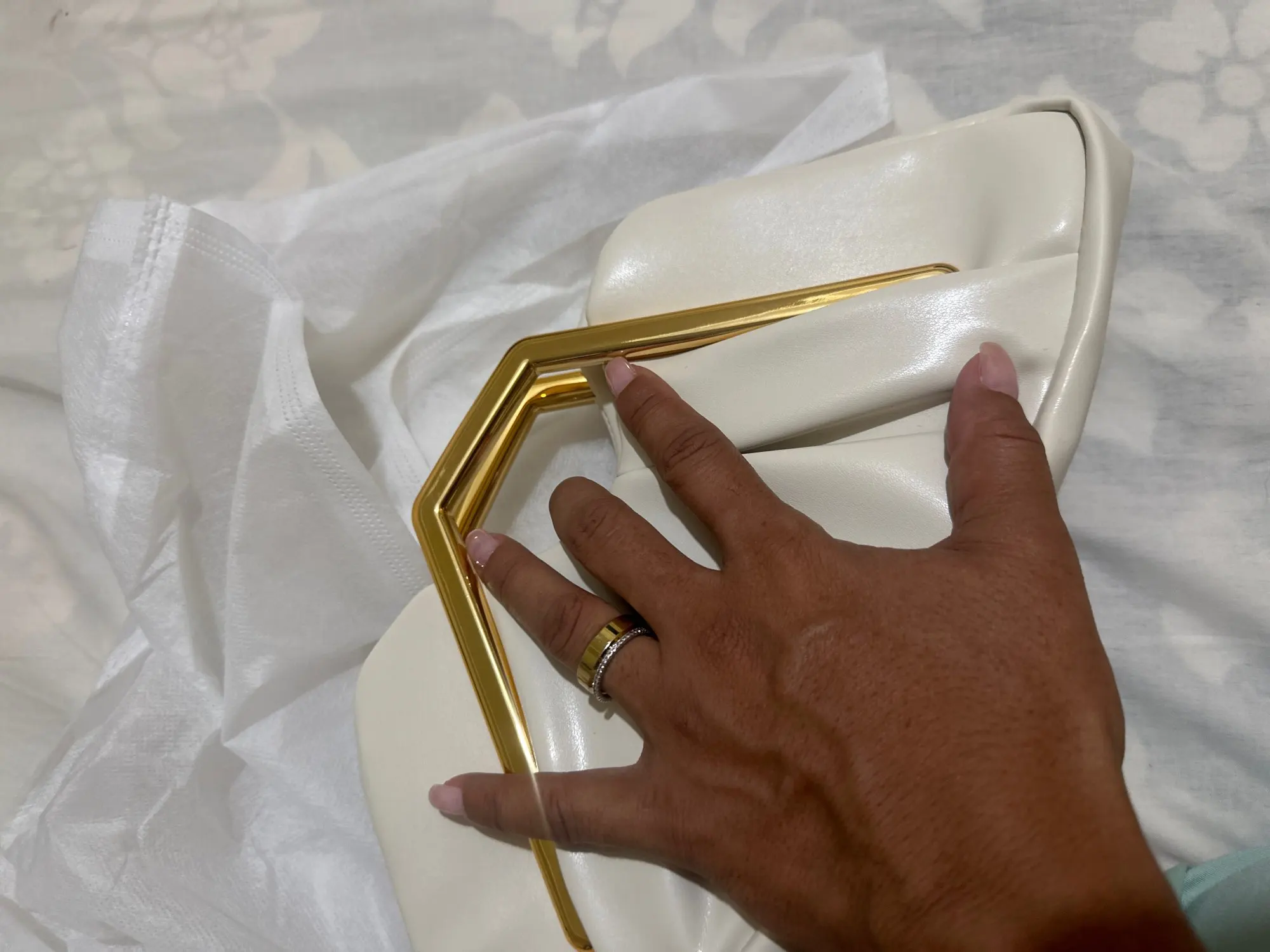Crafted from smooth faux leather and finished with a polished gold-tone handle, Aurelia Clutch balances softness and structure beautifully. The clean lines and elegant folds give it a luxurious, timeless presence.