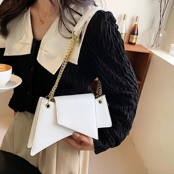 The Urban Angle features a bold geometric silhouette with clean lines and a sleek, structured finish for a modern statement look. Crafted from smooth faux leather with an elegant chain handle, it blends style with everyday practicality. Compact yet functional, it’s perfect for both day and evening wear.