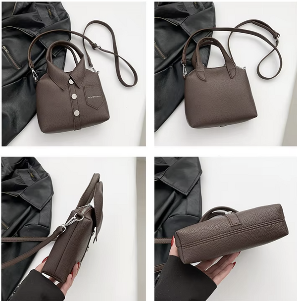 Made from premium textured faux leather, it features a unique shirt-collar design with silver button accents and a structured silhouette. This chic tote offers versatile carry options with top handles and an adjustable crossbody strap—perfect for any occasion.