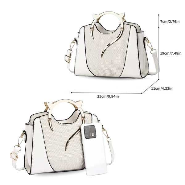 Turn heads with this chic, feline-inspired handbag that perfectly balances elegance and playful sophistication. Featuring a signature ear-tipped gold handle and a gracefully curved tail design, it’s a true statement piece that adds instant charm to any outfit. The structured silhouette and smooth, leather-like finish—enhanced by a subtly textured front panel—create a refined look, while the detachable crossbody strap offers versatile wear from day to night.