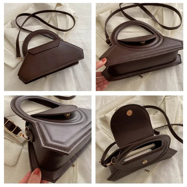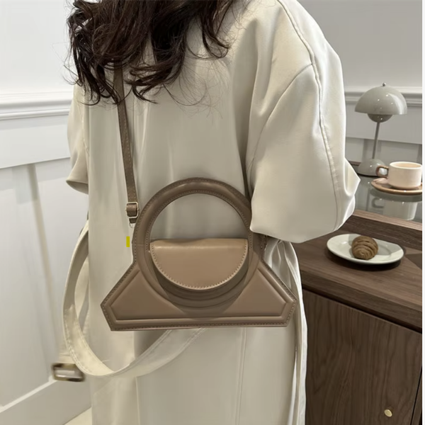 Nexa showcases a beautifully structured silhouette with clean geometric lines and a sculptural circular handle that defines its modern aesthetic. Crafted from smooth faux leather with precise stitching, it maintains its elegant shape while offering a compact yet functional interior. The secure flap closure and adjustable crossbody strap provide versatility and ease.